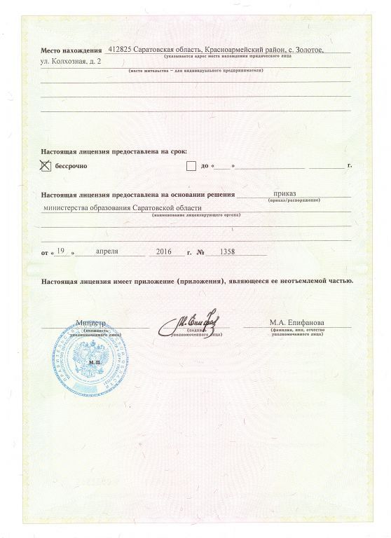 Адрес местонахождения образовательной организации* 412825, Саратовская область, Красноармейский район, с. Золотое, ул. Колхозная, дом 2